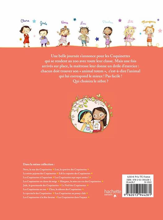 Découvrez une nouvelle histoire de la bande d'amis Les Coquinettes. Aujourd'hui les Coquinettes partent en sortie scolaire : direction le zoo ! Mais la maîtresse leur a donné un devoir : trouver leur "animal-totem" et expliquer en quoi elles se reconnaissent dans cet animal. Pour Phulan, l'exercice est vite fait, ce sera la chouette à lunettes ! Mais pour Nova et Lili : quel casse-tête ! Des histoires qui plaisent aux petites filles comme aux plus grandes grâce à un univers charmant et attachant. Une thématique qui plaît particulièrement aux enfants : le zoo et du fer à dorer sur la couverture font de cet album un incontournable !