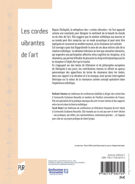 Depuis l'Antiquité, la métaphore des « cordes vibrantes » de l'art apparaît comme une constante pour désigner le sentiment de la beauté du monde ou du choc de l'art. Elle suggère que la relation esthétique aux oeuvres et au monde peut être comprise sur un mode acoustique et peut ainsi être expliquée en recourant au modèle musical, où la résonance est centrale. Cet ouvrage a pour but d'approfondir le sens de ces deux notions clés de la relation esthétique.