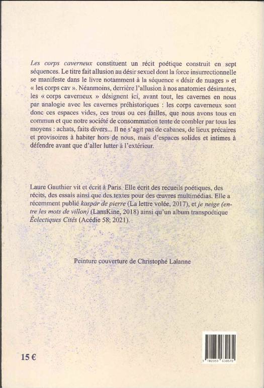 Les corps caverneux (LansKine, septembre 2021) constituent un récit poétique construit en sept séquences. Le titre fait allusion au désir sexuel dont la force insurrectionnelle se manifeste dans le livre notamment à la séquence « désir de nuages « et « les corps cav «. Néanmoins, derrière l’allusion à nos anatomies désirantes, les « corps caverneux « désignent ici, avant tout, les cavernes en nous par analogie avec les cavernes préhistoriques : les corps caverneux sont donc ces espaces vides, ces trous ou ces failles, que nous avons tous en commun et que notre société de consommation tente de combler par tous les moyens : achats, faits divers etc. Il ne s’agit pas de cabanes, de lieux précaires et provisoires à habiter hors de nous, mais d’espaces solides et intimes à défendre avant que d’aller lutter à l’extérieur. Dans chacune des séquences est évoquée une nouvelle attaque contre ces espaces intimes de respiration et de liberté, en réaction à laquelle une musique émerge, une musique de nos cavernes, qui nous permet de nous cabrer et de rester vigilants.
