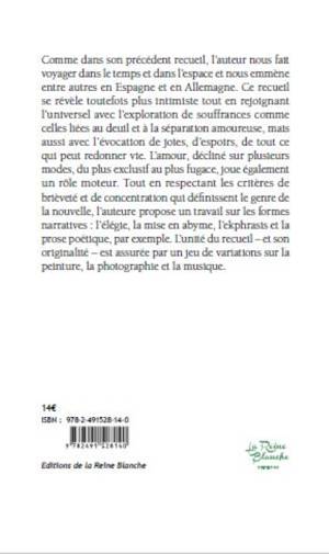 Ce recueil présente 11 nouvelles, toutes inspirées d'Åuvres plastiques ou musicales. Comme dans son précédent recueil (Soupirs, 2017), l'auteure fait voyager le lecteur dans l'espace et le temps, des conséquences de la terrifiante Opération Gomorrhe lancée par la Royal Air Force sur Hambourg en 1943 à l'émigration économique espagnole des années 1960. Parallèlement, l'auteure propose un travail sur les formes narratives : l'élégie, la mise en abyme, l'ekphrasis et la prose poétique, par exemple. L'unité du recueil - et son originalité - est assurée par un jeu de variations sur la peinture, la photographie, la sculpture et la musique.