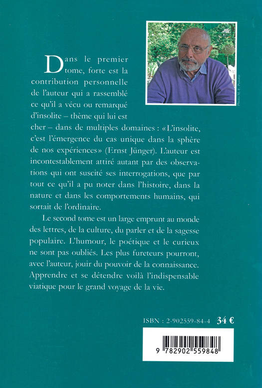 Dans le premier tome, forte est la contribution personnelle de l'auteur qui a rassemblé ce qu'il a vécu ou remarqué d'insolite - thème qui lui est cher - dans de multiples domaines : «L'insolite, c'est l'émergence du cas unique dans la sphère de nos expériences» (Ernst Jünger). L'auteur est incontestablement attiré autant par des observations qui ont suscité ses interrogations, que par tout ce qu'il a pu noter dans l'histoire, dans la nature et dans les comportements humains, qui sortait de l'ordinaire. Le second tome est un large emprunt au monde des lettres, de la culture, du parler et de la sagesse populaire. L'humour, le poétique et le curieux ne sont pas oubliés. Les plus fureteurs pourront, avec l'auteur, jouir du pouvoir de la connaissance. Apprendre et se détendre voilà l'indispensable viatique pour le grand voyage de la vie.