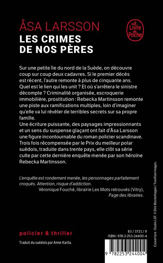 Sur une petite île du nord de la Suède, on découvre coup sur coup deux cadavres. Si le premier décès est récent, l’autre remonte à plus de cinquante ans. Quel est le lien qui les unit ? Et où s’arrêtera le sinistre décompte ? Criminalité organisée, escroquerie immobilière, prostitution : Rebecka remonte une piste aux ramifications multiples, loin d’imaginer qu’elle va lui révéler de terribles secrets sur l’histoire de sa propre famille. Une écriture puissante, des paysages impressionnants et un sens du suspense glaçant ont fait d’Åsa Larsson une figure incontournable du polar scandinave. Trois fois récompensée par le Prix du meilleur polar suédois, traduite dans trente pays, elle poursuit sa série culte dans les pas de son héroïne Rebecka Martinsson.