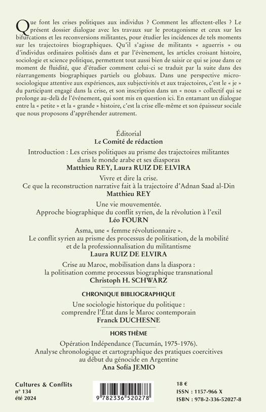 Que font les crises politiques aux individus ? Comment les affectent-elles ? Le présent dossier dialogue avec les travaux sur le protagonisme et ceux sur les bifurcations et les reconversions militantes, pour étudier les incidences de tels moments sur les trajectoires biographiques. Qu'il s'agisse de militants aguerris ou d'individus ordinaires politisés dans et par l'évènement, les articles croisant histoire, sociologie et science politique, permettent tout aussi bien de saisir ce qui se joue dans ce moment de fluidité, que d'étudier comment celui-ci se traduit par la suite dans des réarrangements biographiques partiels ou globaux. Dans une perspective microsociologique attentive aux expériences, aux subjectivités et aux trajectoires, c'est le je du participant engagé dans la crise, et son inscription dans un nous collectif qui se prolonge au-delà de l'événement, qui sont mis en question ici. En entamant un dialogue entre la petite et la grande histoire, c'est la crise elle-même et son épaisseur sociale que nous proposons d'appréhender autrement.