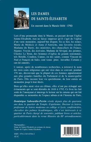 L'église Sainte-Elisabeth, dans le Marais, appartenait anciennement à un monastère désormais disparu. L'auteur s'est intéressée à ce lieu oublié et aux trois cents religieuses qui l'ont habité et qui appartenaient à de grandes familles parisiennes. On découvre le quotidien de ces femmes et ce qu'elles ont vécu durant les évènements survenus entre 1616 et 1792. C'est également l'occasion de s'interroger sur les raisons de la disparition de ce lieu de culte.
