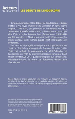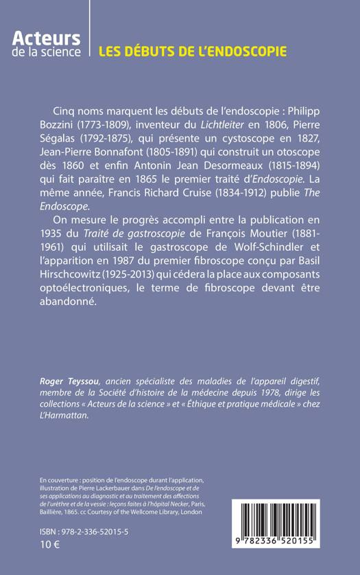 Cinq noms marquent les débuts de l'endoscopie: Philipp Bozzini (1773-1809), inventeur du Lichtleiter en 1806, Pierre Ségalas (1792-1875), qui présente un cystoscope en 1827, Jean-Pierre Bonnafont (1805-1891) qui construit un otoscope dès 1860 et enfin Antonin Jean Desormeaux (1815-1894) qui fait paraître en 1865 le premier traité d'Endoscopie. La même année, Francis Richard Cruise (1834-1912) publie The Endoscope. On mesure le progrès accompli entre la publication en 1935 du Traité de gastroscopie de François Moutier (1881-1961) qui utilisait le gastroscope de Wolf-Schindler et l'apparition en 1987 du premier fibroscope conçu par Basil Hirschcowitz (1925-2013) qui cédera la place aux composants optoélectroniques, le terme de fibroscope devant être abandonné.