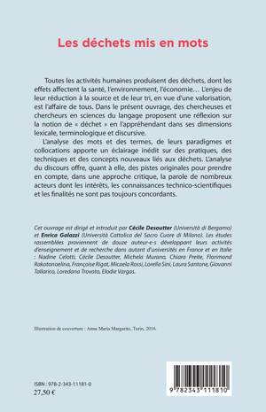 Des chercheuses et chercheurs proposent ici une réflexion sur la notion de "déchet". L'analyse des mots et des termes, de leurs paradigmes et collocations apporte un éclairage inédit sur des pratiques, des techniques et des concepts nouveaux liés aux déchets. L'analyse du discours offre des pistes originales pour prendre en compte la parole de nombreux acteurs dont les intérêts, les connaissances technico - scientifiques et les finalités ne sont pas toujours concordants.