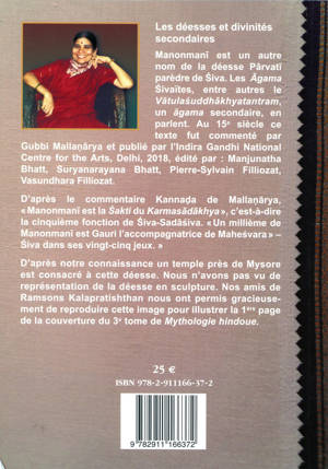 « Les déesses et divinités secondaires » concluent la série des trois ouvrages dédiés à la mythologie hindoue. Les deux premiers tomes présentent Visnu, le dieu protecteur, et Siva, le dieu destructeur. « Les penseurs indiens croient que l’homme ne peut rien faire seul. Donc, naquit l’idée des déesses qui sont l’énergie du masculin.». Vasundhara Filliozat complète donc naturellement sa trilogie avec l’étude des principales déesses de la mythologie hindoue pour appréhender cette tradition dans son intégralité. Les déesses et divinités secondaires. Manonmani est un autre nom de la déesse Parvati parèdre de Siva. Les Agama Sivaïtes, entre autres le Vatulasuddhakhyatantram, un agama secondaire, en parlent. Au XVe siècle ce texte fut commenté par Gubbi Malla?arya et publié par l’Indira Gandhi National Centre for the Arts, Delhi, 2018, édité par : Manjunatha Bhatt, Suryanarayana Bhatt, Pierre-Sylvain Filliozat, Vasundhara Filliozat. D’après le commentaire Kanna?a de Malla?arya, «?Manonmani est la Sakti du Karmasadakhya?», c’est-à-dire la cinquième fonction de Siva-Sadasiva. «?Un millième de Manonmani est Gauri l’accompagnatrice de Mahesvara?» – Siva dans ses vingt-cinq jeux. » D’après notre connaissance un temple près de Mysore est consacré à cette déesse. Nous n’avons pas vu de représentation de la déesse en sculpture. Nos amis de Ramsons Kalapratishthan nous ont permis gracieusement de reproduire cette image pour illustrer la première page de la couverture du 3e tome de Mythologie hindoue.