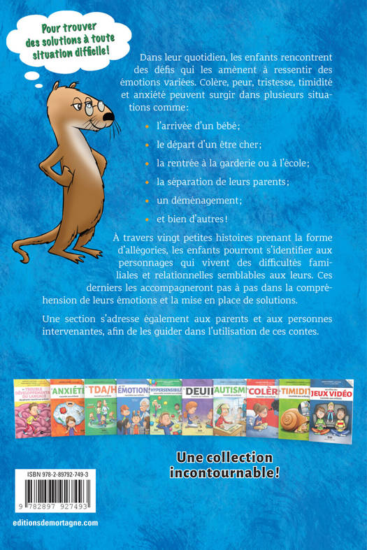 Dans leur quotidien, les enfants rencontrent des défis qui les amènent à ressentir des émotions variées. Colère, peur, tristesse, timidité et anxiété peuvent surgir dans plusieurs situations comme : l’arrivée d’un bébé ; le départ d’un être cher ; la rentrée à la garderie ou à l’école ; la séparation de leurs parents ; un déménagement ; et bien d’autres ! À travers vingt petites histoires sous la forme d’allégories, les enfants s’identifieront aux personnages qui vivent des difficultés familiales et relationnelles semblables aux leurs. Ceux-ci les accompagneront pas à pas dans l’analyse de leurs émotions et la découverte de solutions. Une section s’adresse également aux parents et personnes intervenantes, afin de les guider dans l’utilisation de ces contes.