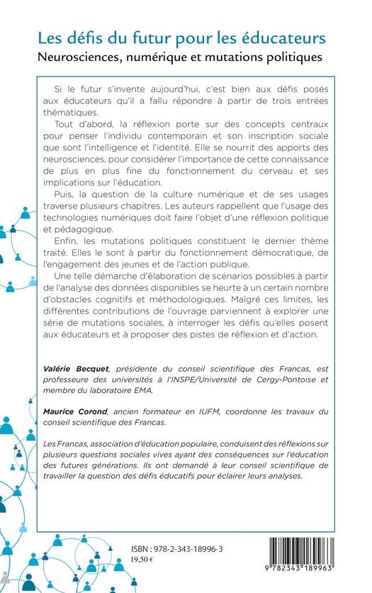 Si le futur s'invente aujourd'hui, c'est bien aux défis posés aux éducateurs qu'il a fallu répondre à partir de trois entrées thématiques. Tout d'abord, la réflexion porte sur des concepts centraux pour penser l'individu contemporain et son inscription sociale que sont l'intelligence et l'identité. Elle se nourrit des apports des neurosciences pour considérer l'importance de cette connaissance de plus en plus fine du fonctionnement du cerveau et ses implications sur l'éducation.