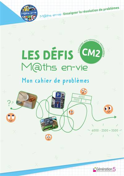 Les défis Maths en-vie – Mon cahier de problèmes CM2 est destiné à l’élève et vient en complément du guide pédagogique Maths en-vie - Enseigner la résolution de problèmes au CM. Il regroupe les différentes activités : photos-problèmes, exercices de compréhension, problèmes d’entraînement, plan de travail et problèmes de recherche. Il permet à l’élève d'avoir son propre support papier et de résoudre directement les problèmes dans le cahier. Il permet également à l’enseignant de gagner du temps et de réduire le nombre de photocopies.