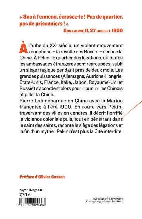 A l'aube du XXe siècle, un violent mouvement xénophobe (la révolte des Boxers) secoue la Chine. A Pékin, le quartier des légations, où toutes les ambassades étrangères sont regroupées, subit un siège tragique pendant près de deux mois. Les grandes puissances (Allemagne, Autriche-Hongrie, Etats-Unis, France, Italie, Japon, Royaume-Uni et Russie) s'accordent alors pour "punir" les Chinois et piller la Chine. La répression sera terriblement brutale et féroce. Pierre Loti débarque en Chine avec la Marine française à l'été 1900. En route vers Pékin, traversant des villes en cendres, il décrit horrifié la violence coloniale puis, tout en pénétrant dans le saint des saints, raconte le siège des légation et la fin d'un mythe : Pékin n'est plus la Cité interdite. Un témoignage exceptionnel.