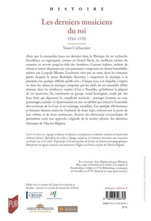 Alors que la monarchie lance ses derniers feux, la Musique du roi recherche l’excellence en regroupant, comme au Grand Siècle, les meilleurs artistes du royaume et recrute jusqu’au-delà des frontières. Castrats italiens, enfants de choeur et autres chanteurs aux voix puissantes composent un choeur formidable, admiré par Leopold Mozart. L’orchestre n’est pas en reste, dont les virtuoses parmi lesquels le jeune Rodolphe Kreutzer « emportent la musique à la première vue quelque difficile qu’elle soit ». Chaque jour, à la chapelle, à l’opéra ou dans les salons, la musique composée par les chefs de cet ensemble d’élite résonne dans les résidences royales. C’est à Versailles qu’habitent la plupart de ces musiciens. Ils constituent un groupe social homogène, soudé par des liens forts qui dépassent la complicité musicale : mariages heureux ou non, parrainages, amitiés s’y épanouissent en une sociabilité qui s’étend à l’ensemble des serviteurs de la Cour et au voisinage versaillais. Ces quelque 400 hommes et femmes laissent entrevoir l’intimité de leurs logis, entrouvrent la porte de leur culture et de leurs sentiments. Acteurs du cérémonial monarchique, ils permettent aussi une approche originale de la société urbaine des dernières décennies de l’Ancien Régime.