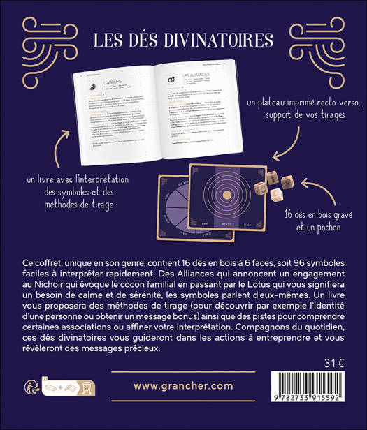 Ce coffret, unique en son genre, contient 16 dés en bois à 6 faces, soit 96 symboles faciles à interpréter rapidement. Pas de cartes à battre, d’apprentissage laborieux à faire ni de connaissances préalables à avoir ! Des Alliances qui annoncent un engagement au Nichoir qui évoque le cocon familial en passant par le Lotus qui vous signifiera un besoin de calme et de sérénité, les symboles parlent d’eux-mêmes. Un livre vous proposera des méthodes de tirages (pour découvrir par exemple l’identité d’une personne ou obtenir un message bonus) ainsi que des pistes pour comprendre certaines associations ou affiner votre interprétation, si vous souhaitez aller plus loin. Compagnons du quotidien, ces dés divinatoires vous guideront dans les actions à entreprendre et vous révèleront des messages précieux.