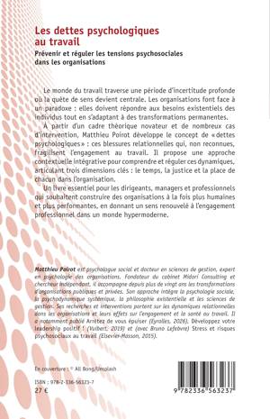 Le monde du travail traverse une période d'incertitude profonde où la quête de sens devient centrale. Les organisations font face à un paradoxe: elles doivent répondre aux besoins existentiels des individus tout en s'adaptant à des transformations permanentes. À partir d'un cadre théorique novateur et de nombreux cas d'intervention, Matthieu Poirot développe le concept de dettes psychologiques ces blessures relationnelles qui, non reconnues, fragilisent l'engagement au travail. Il propose une approche contextuelle intégrative pour comprendre et réguler ces dynamiques, articulant trois dimensions clés: le temps, la justice et la place de chacun dans l'organisation. Un livre essentiel pour les dirigeants, managers et professionnels qui souhaitent construire des organisations à la fois plus humaines et plus performantes, en donnant un sens renouvelé à l'engagement professionnel dans un monde hypermoderne.