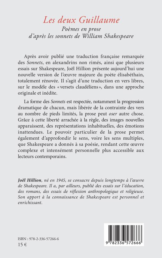 Après avoir publié une traduction française remarquée des Sonnets, en alexandrins non rimés, ainsi que plusieurs essais sur Shakespeare, Joël Hillion présente aujourd'hui une nouvelle version de l'oeuvre majeure du poète élisabéthain, totalement rénovée. Il s'agit d'une traduction en vers libres, sur le modèle des versets claudéliens, dans une approche originale et inédite. La forme des Sonnets est respectée, notamment la progression dramatique de chacun, mais libérée de la contrainte des vers au nombre de pieds limités, la prose peut oser autre chose. Grâce à cette liberté arrachée à la règle, des images nouvelles apparaissent, des représentations inhabituelles, des émotions inattendues. Le pouvoir particulier de la prose permet également d'approfondir le sens, voire les sens multiples, que Shakespeare a donnés à sa poésie, rendant cette oeuvre complexe et intensément personnelle plus accessible aux lecteurs contemporains.