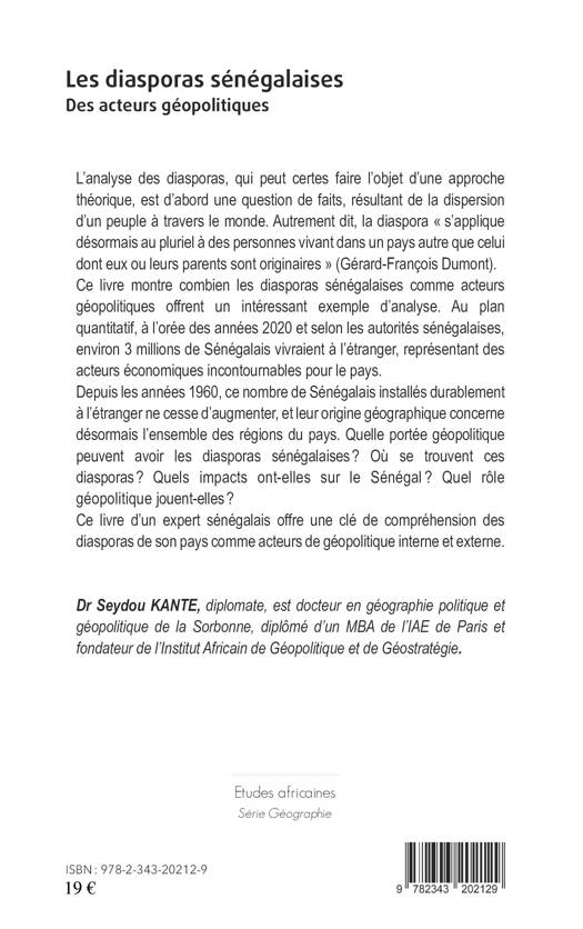 Ce livre montre combien les diasporas sénégalaises comme acteurs géopolitiques offrent un intéressant exemple d'analyse. Depuis les années 1960, le nombre de Sénégalais installés durablement à l'étranger ne cesse d'augmenter, et leur origine géographique concerne désormais l'ensemble des régions du pays. Quelle portée géopolitique peuvent avoir les diasporas sénégalaises ? Où se trouvent ces diasporas ? Quels impacts ont-elles sur le Sénégal ? Quel rôle géopolitique jouent-elles ?