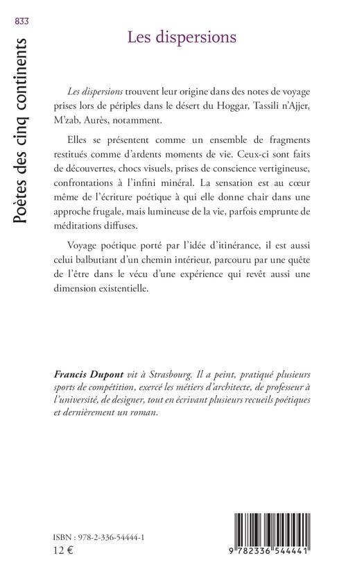 Les dispersions trouvent leur origine dans des notes de voyage prises lors de périples dans le désert du Hoggar, Tassili n'Ajjer, M'zab, Aurès, notamment. Elles se présentent comme un ensemble de fragments restitués comme d'ardents moments de vie. Ceux-ci sont faits de découvertes, chocs visuels, prises de conscience vertigineuse, confrontations à l'infini minéral. La sensation est au coeur même de l'écriture poétique à qui elle donne chair dans une approche frugale, mais lumineuse de la vie, parfois emprunte de méditations diffuses. Voyage poétique porté par l'idée d'itinérance, il est aussi celui balbutiant d'un chemin intérieur, parcouru par une quête de l'être dans le vécu d'une expérience qui revêt aussi une dimension existentielle.