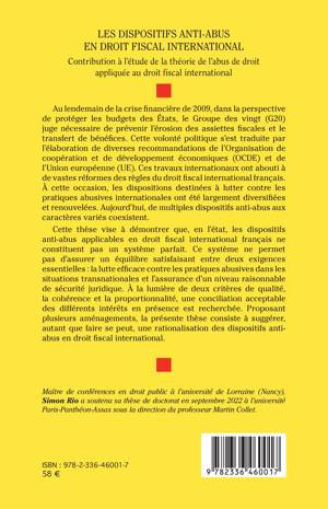 Au lendemain de la crise financière de 2009, dans la perspective de protéger les budgets des États, le Groupe des vingt (G20) juge nécessaire de prévenir l'érosion des assiettes fiscales et le transfert de bénéfices. Cette volonté politique s'est traduite par l'élaboration de diverses recommandations de l'Organisation de coopération et de développement économiques (OCDE) et de l'Union européenne (UE). Ces travaux internationaux ont abouti à de vastes réformes des règles du droit fiscal international français. À cette occasion, les dispositions destinées à lutter contre les pratiques abusives internationales ont été largement diversifiées et renouvelées. Aujourd'hui, de multiples dispositifs anti-abus aux caractères variés coexistent. Cette thèse vise à démontrer que, en l'état, les dispositifs anti-abus applicables en droit fiscal international français ne constituent pas un système parfait. Ce système ne permet pas d'assurer un équilibre satisfaisant entre deux exigences essentielles: la lutte efficace contre les pratiques abusives dans les situations transnationales et l'assurance d'un niveau raisonnable de sécurité juridique. À la lumière de deux critères de qualité, la cohérence et la proportionnalité, une conciliation acceptable des différents intérêts en présence est recherchée. Proposant plusieurs aménagements, la présente thèse consiste à suggérer, autant que faire se peut, une rationalisation des dispositifs anti-abus en droit fiscal international.