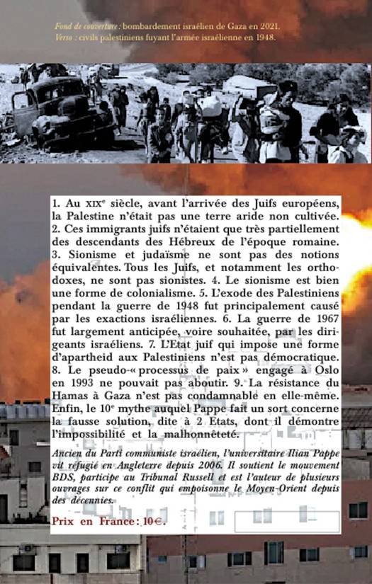1. Au XIXe siècle, avant l'arrivée des Juifs européens, la Palestine n'était pas une terre aride non cultivée. 2. Ces immigrants juifs n'étaient que très partiellement des descendants des Hébreux de l'époque romaine. 3. Sionisme et judaïsme ne sont pas des notions équivalentes. Tous les Juifs, et notamment les orthodoxes, ne sont pas sionistes. 4. Le sionisme est bien une forme de colonialisme. 5. L'exode des Palestiniens pendant la guerre de 1948 fut principalement causé par les exactions israéliennes. 6. La guerre de 1967 fut largement anticipée, voire souhaitée, par les dirigeants israéliens. 7. L'Etat juif qui impose une forme d'apartheid aux Palestiniens n'est pas démocratique. 8. Le pseudo-«processus de paix» engagé à Oslo en 1993 ne pouvait pas aboutir. 9. La résistance du Hamas à Gaza n'est pas condamnable en elle-même.? Enfin, le 10e mythe auquel Pappe fait un sort concerne la fausse solution, dite à 2 Etats, dont il démontre l'impossibilité et la malhonnêteté.