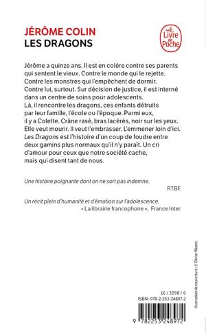 Jérôme a quinze ans. Il est en colère contre ses parents qui sentent le vieux. Contre le monde qui le rejette. Contre les monstres qui l’empêchent de dormir. Contre lui surtout. Sur décision de justice, il est interné dans un centre de soins pour adolescents. Là, il rencontre les dragons, ces enfants détruits par leur famille, l’école ou l’époque. Parmi eux, il y a Colette. Crâne rasé, bras lacérés, noir sur les yeux. Elle veut mourir. Il veut l’embrasser. L’emmener loin d’ici.