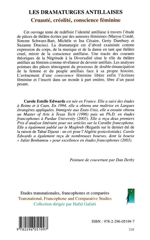 Cet ouvrage tente de redéfinir l'identité antillaise à travers l'étude de pièces de théâtre écrites par des auteures féminines (Maryse Condé, Simone Schwarz-Bart, Michèle et Ina Césaire, Gerty Dambury et Suzanne Dracius). La dramaturgie est d'abord examinée comme expression du corps, de la musique et de la danse en tant que théâtre cruel, miroir de la conscience antillaise. Une tracée des courants théoriques de la Négritude à la Diversité situe le rôle du théâtre antillais au féminin comme révélateur du devenir antillais.