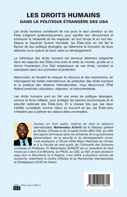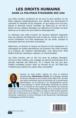 La rhétorique des droits humains est devenue tellement prégnante dans les rapports des États-Unis avec le reste du monde, qu'elle en a donné l'impression d'un État respectueux de ces droits, constant et exemplaire dans leur promotion et protection. Néanmoins, en fendant le masque du discours et des impressions, en interrogeant les traités internationaux de protection des droits humains et la pratique des relations internationales, nous découvrons l'État fédéral américain calculateur, objecteur et instrumentaliste. Les droits humains sont en fait une arme de politique étrangère pour protéger les besoins économiques et la sécurité nationale des États-Unis. Et à chaque fois que ces deux intérêts considérés comme vitaux se trouvent en jeu, les États-Unis n'hésitent pas à piétiner les valeurs dites universelles.