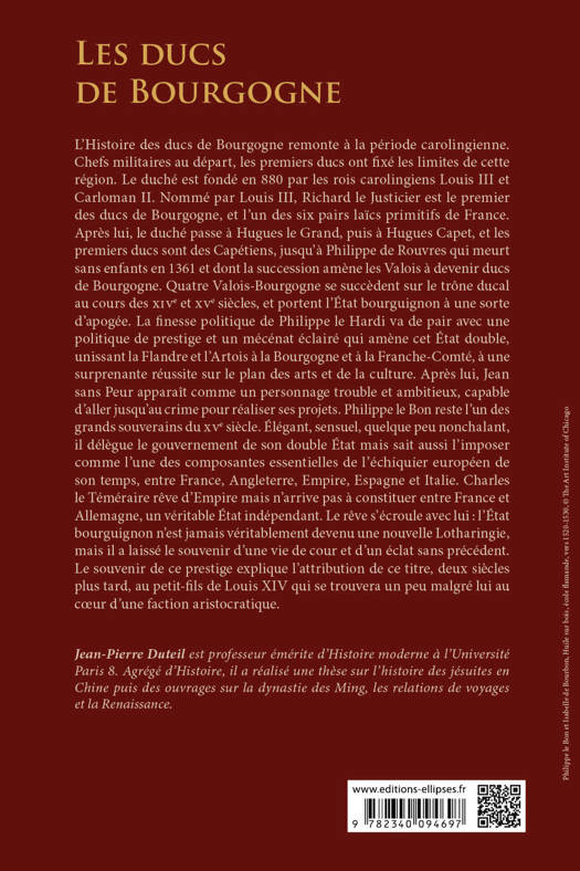L’histoire des ducs de Bourgogne remonte à la période carolingienne. Chefs militaires au départ, les premiers ducs ont fixé les limites de cette région. Le duché est fondé en 880 par les rois carolingiens Louis III et Carloman II. Nommé par Louis III, Richard le Justicier est le premier des ducs de Bourgogne, et l’un des six pairs laïcs primitifs de France. Après lui, le duché passe à Hugues le Grand, puis à Hugues Capet, et les premiers ducs sont des Capétiens, jusqu’à Philippe de Rouvres qui meurt sans enfants en 1361 et dont la succession amène les Valois à devenir ducs de Bourgogne. Quatre Valois-Bourgogne se succèdent sur le trône ducal au cours des XIVe et XVe siècles, et portent l’État bourguignon à une sorte d’apogée. La finesse politique de Philippe le Hardi va de pair avec une politique de prestige et un mécénat éclairé qui amène cet État double, unissant la Flandre et l’Artois à la Bourgogne et à la Franche-Comté, à une surprenante réussite sur le plan des arts et de la culture. Après lui, Jean sans Peur apparaît comme un personnage trouble et ambitieux, capable d’aller jusqu’au crime pour réaliser ses projets. Philippe le Bon reste l’un des grands souverains du XVe siècle. Élégant, sensuel, quelque peu nonchalant, il délègue le gouvernement de son double État mais sait aussi l’imposer comme l’une des composantes essentielles de l’échiquier européen de son temps, entre France, Angleterre, Empire, Espagne et Italie. Charles le Téméraire rêve d’Empire mais n’arrive pas à constituer entre France et Allemagne, un véritable État indépendant. Le rêve s’écroule avec lui : l’État bourguignon n’est jamais véritablement devenu une nouvelle Lotharingie, mais il a laissé le souvenir d’une vie de cour et d’un éclat sans précédent. Le souvenir de ce prestige explique l’attribution de ce titre, deux siècles plus tard, au petit-fils de Louis XIV qui se trouvera un peu malgré lui au cœur d’une faction aristocratique.