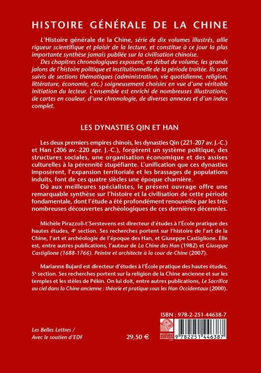 English summary: This book offers a remarkable synthesis of the history and civilization of the Qin (221-207 BC) and Han (206 BC - 220 AD) dynasties, a fundamental period of Chinese history that has been greatly enhanced by numerous archaeological discoveries in recent decades. French description: L'Histoire generale de la Chine, serie de dix volumes illustres, allie rigueur scientifique et plaisir de la lecture, et constitue a ce jour la plus importante synthese jamais publiee sur la civilisation chinoise. Des chapitres chronologiques exposent, en debut de volume, les grands jalons de l'histoire politique et institutionnelle de la periode traitee. Ils sont suivis de sections thematiques (administration, vie quotidienne, religion, litterature, economie, etc.) soigneusement choisies en vue d'une veritable initiation du lecteur. L'ensemble est enrichi de nombreuses illustrations, de cartes en couleur, d'une chronologie, de diverses annexes et d'un index complet.LES DYNASTIES QIN ET HAN Les deux premiers empires chinois, les dynasties Qin (221-207 av. J.-C.) et Han (206 av.-220 apr. J.-C.), forgerent un systeme politique, des structures sociales, une organisation economique et des assises culturelles a la perennite stupefiante. L'unification que ces dynasties imposerent, l'expansion territoriale et les brassages de populations induits, font de ces quatre siecles une epoque charniere. Du aux meilleures specialistes, le present ouvrage offre une remarquable synthese sur l'histoire et la civilisation de cette periode fondamentale, dont l'etude a ete profondement renouvelee par les tres nombreuses decouvertes archeologiques de ces dernieres decennies.