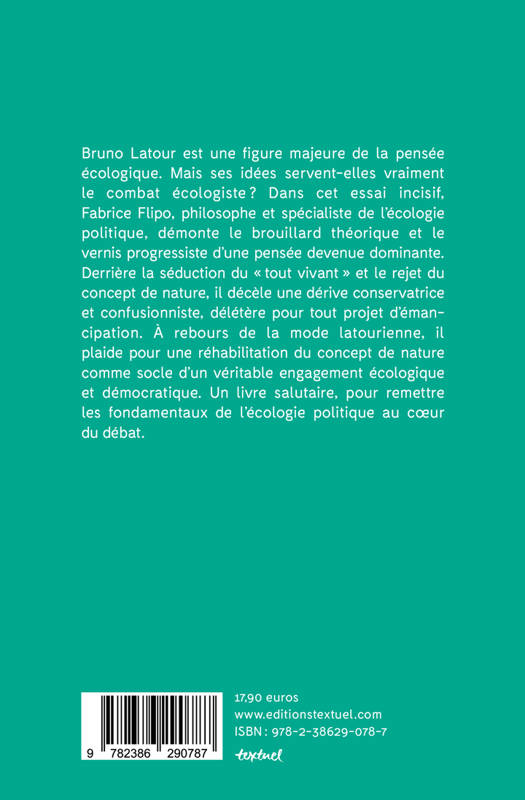 Fabrice Flipo approfondit ici la controverse entre les latouriens et les non latouriens. Selon lui, l'abandon de la distinction entre nature et culture prônée par Latour au profit d'un grand tout du vivant produit de la confusion. Le concept de nature lui semble essentiel pour penser la responsabilité humaine et s'impose comme un moteur du combat politique. Une mise en perspective audacieuse de la pensée de Latour.