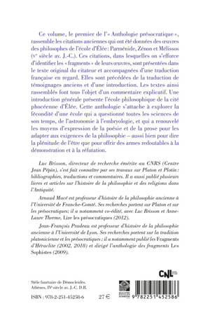 Ce volume, le premier de l' Anthologie presocratique , rassemble les citations anciennes qui ont ete donnees des oeuvres des philosophes de l'ecole d'Elee: Parmenide, Zenon et Melissos (Ve siecle av. J.-C.). Ces citations, dans lesquelles on s'efforce d'identifier les fragments de leurs oeuvres, sont presentees dans le texte original du citateur et accompagnees d'une traduction francaise en regard. Elles sont precedees de la traduction de temoignages anciens et d'une introduction. Les textes ainsi rassembles font tous l'objet d'un commentaire explicatif. Une introduction generale presente l'ecole philosophique de la cite phoceenne d'Elee. Cette anthologie s'attache a explorer la fecondite d'une ecole qui a questionne toutes les sciences de son temps, de l'astronomie a l'embryologie, et qui a renouvele les moyens d'expression de la poesie et de la prose pour les adapter aux exigences de la philosophie - aussi bien pour dire la plenitude de l'etre que pour offrir des armes redoutables a la demonstration et a la refutation.