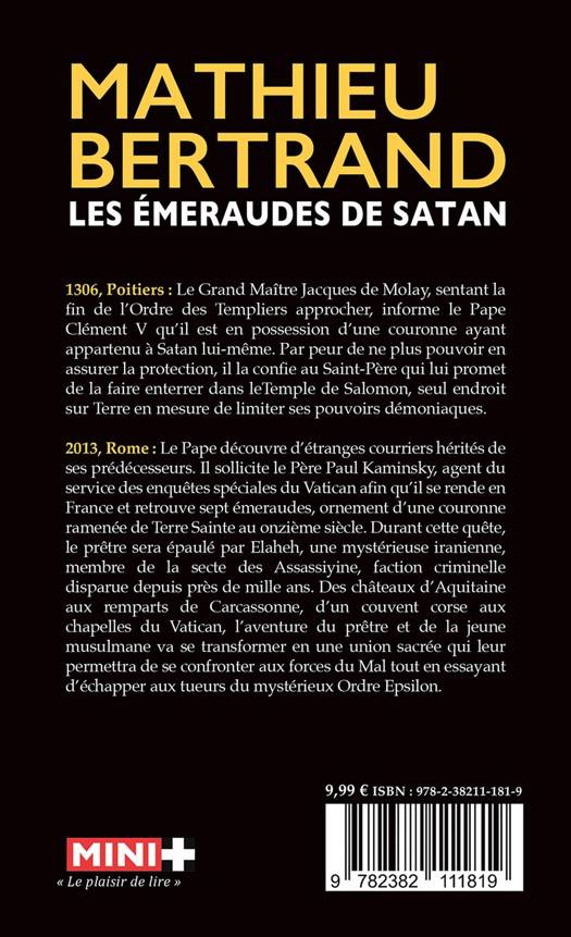 1306, Poitiers : Le Grand Maître Jacques de Molay, sentant la fin de l’Ordre des Templiers approcher, informe le Pape Clément V qu’il est en possession d’une couronne ayant appartenu à Satan lui-même. Par peur de ne plus pouvoir en assurer la protection, il la confie au Saint-Père qui lui promet de la faire enterrer dans le Temple de Salomon, seul endroit sur Terre en mesure de limiter ses pouvoirs démoniaques. 2013, Rome : Le Pape découvre d’étranges courriers hérités de ses prédécesseurs. Il sollicite le Père Paul Kaminsky, agent du service des enquêtes spéciales du Vatican afin qu’il se rende en France et retrouve sept émeraudes, ornement d’une couronne ramenée de Terre Sainte au onzième siècle. Durant cette quête, le prêtre sera épaulé par Elaheh, une mystérieuse Iranienne, membre de la secte des Assassiyine, faction criminelle disparue depuis près de mille ans. Des châteaux d’Aquitaine aux remparts de Carcassonne, d’un couvent corse aux chapelles du Vatican, l’aventure du prêtre et de la jeune musulmane va se transformer en une union sacrée qui leur permettra de se confronter aux forces du Mal tout en essayant d’échapper aux tueurs du mystérieux Ordre Epsilon. Bienvenu dans l’univers de l’ésotérique et du surnaturel, une histoire captivante qui a pour origine les Chevaliers du Temple. Une quête qui mènera nos héros à découvrir des lieux et des phénomèns qu’ils n’auraient jamais imaginés. Une association et une entraide inhabituelle pour entraver les forces du mal qui sont à l’oeuvre. Est-ce que l’heure de Satan a sonné ? Un récit dans la lignée des plus grands noms de la catégorie. Sur les traces des plus grands noms du thriller ésotérique !