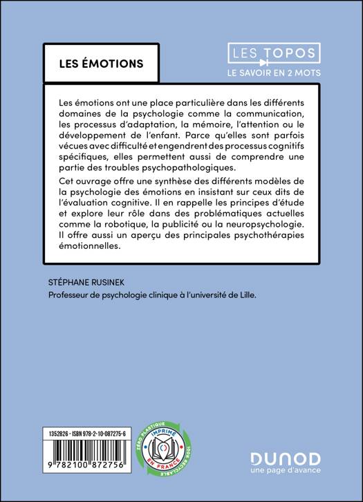 Cet ouvrage offre une synthèse des différents modèles de la psychologie des émotions en insistant sur ceux dits de l’évaluation cognitive. Il en rappelle les principes d’étude et explore leur rôle dans des problématiques actuelles comme la robotique, la publicité ou la neuropsychologie. Il offre aussi un aperçu des principales psychothérapies émotionnelles.