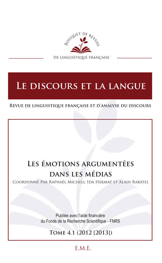 L'émotion argumentée autour des identités dans les genres médiatiques, Ida Hekmat, Raphaël Micheli & Alain Rabatel / Argumentations de la colère face aux "caricatures de Mahomet" et constructions identitaires, Ida Hekmat / Expression et gestion des émotions dans les talk-shows télévisés de type conflflictuel. Le cas de Tout le monde en parle et On n'est pas couché, Alina Oprea / L'émotionalité au service de l'argumentation sur le répondeur de l'émission Là-bas, si j'y suis, Heike Baldauf-Quilliatre...
