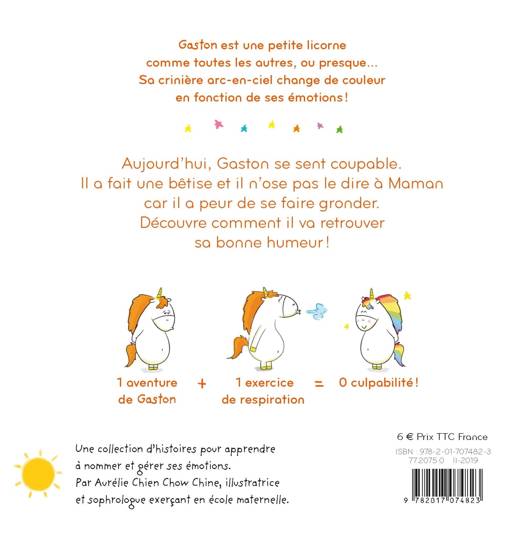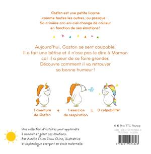 Gaston est une petite licorne comme toutes les autres, ou presque… Sa crinière arc-en-ciel change de couleur en fonction de ses émotions ! Aujourd’hui, Gaston s’en veut. Il se sent coupable. Il a fait une grosse bêtise dans sa chambre. Découvre comment il va faire pour la réparer et retrouver sa bonne humeur ! À la fin de l’histoire, un exercice de respiration pour aider l’enfant à gérer son émotion.