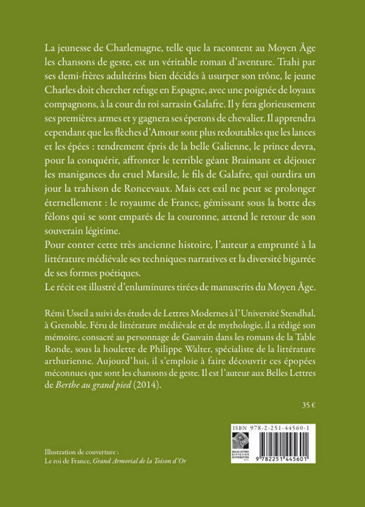 English summary: Charlemagne's youth, as told by the epics of the Middle Ages, is a story of adventure. Betrayed by half-brothers who were determined to usurp his throne, Charlemagne sought refuge in Spain at the court of the Saracen King Galafre. However, this exile would not last forever. In this retelling, the author has borrowed both the narrative techniques and poetic forms of medieval literature. The story is also lavishly illustrated with illuminations taken from medieval manuscripts. French description: La jeunesse de Charlemagne, telle que la racontent au Moyen Age les chansons de geste, est un veritable roman d'aventure. Trahi par ses demi-freres adulterins bien decides a usurper son trone, le jeune Charles doit chercher refuge en Espagne, avec une poignee de loyaux compagnons, a la cour du roi sarrasin Galafre. Il y fera glorieusement ses premieres armes et y gagnera ses eperons de chevalier. Il apprendra cependant que les fleches d'Amour sont plus redoutables que les lances et les epees: tendrement epris de la belle Galienne, le prince devra, pour la conquerir, affronter le terrible geant Braimant et dejouer les manigances du cruel Marsile, le fils de Galafre, qui ourdira un jour la trahison de Roncevaux. Mais cet exil ne peut se prolonger eternellement: le royaume de France, gemissant sous la botte des felons qui se sont empares de la couronne, attend le retour de son souverain legitime. Pour conter cette tres ancienne histoire, l'auteur a emprunte a la litterature medievale ses techniques narratives et la diversite bigarree de ses formes poetiques. Le recit est somptueusement illustre d'enluminures tirees de manuscrits du Moyen Age.