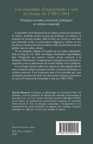 L'ensemble à vent fait partie de ces objets sonores qui traversent les siècles. Symbole associé au pouvoir politique ou militaire, il sonorise les entrées royales, offre le faste des cuivres et des bois aux solennités civiles ou processions religieuses, rythme au son des fifres et tambours le pas du soldat et offre les premiers concerts publics dans le milieu urbain. De ses lointaines origines il ne garde que son aspect ostentatoire. Tout au long du XVIIIe siècle une longue construction organologique faite d'emprunts aux nations voisines donne naissance à la Musique d'Harmonie. Compositeurs et interprètes produisent pour ce phénomène de société mêlant civil et militaire. Le présent ouvrage entend explorer les aspects les plus significatifs de cette évolution mêlant pratiques sociales, insertions politiques et création musicale. Il est le premier opus d'un ensemble qui, tout en laissant une place de choix aux documents d'époque, permettra de suivre l'évolution de l'ensemble à vent de 1700 à 1914.