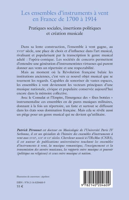 Dans sa lente construction, l'ensemble à vent gagne, au XVIIIe siècle, une place de choix et d'influence dans l'art musical, rivalisant et popularisant par la transcription le genre musical adulé : l'opéra-comique. Les sociétés de concerts permettent d'entendre une génération d'instrumentistes virtuoses qui purent donner aux vents un répertoire et une respectabilité. Mais au moment où la Révolution française balaie les institutions anciennes, c'est vers ce nouvel objet musical que se tournent les regards. Capables de sonoriser de vastes espaces, les ensembles à vent deviennent les vecteurs principaux d'une musique nationale, civique et populaire conservée aujourd'hui encore dans la mémoire collective. Avec le Consulat et l'Empire, l'émergence des « fêtes bottées » instrumentalise ces ensembles en de pures musiques militaires, donnant à la fois un répertoire, un faste et surtout se diffusant dans les états sous domination française. Mais cela se révèle aussi un piège pour un genre musical qui ne devient qu'utilitaire.