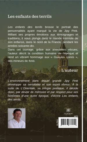 Les enfants des terrils brosse le portrait des personnalités ayant marqué la vie de Jipy Pink. Mêlant ses propres émotions aux témoignages et traditions, il nous plonge dans le monde intimiste de son enfance, dans le nord de la France, pendant les années soixante-dix. Dans cet ouvrage, grâce aux anecdotes vécues, l'auteur décrit la condition humaine de l'époque et rend un vibrant hommage aux Gueules noires, des mineurs de fond.