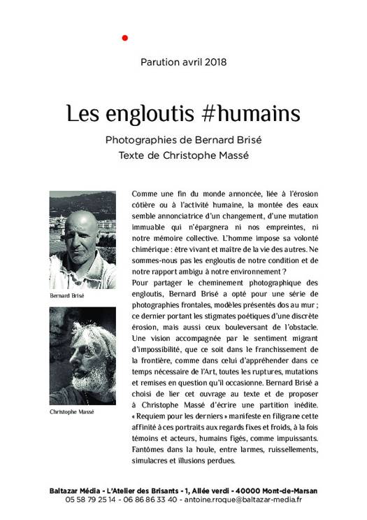 Comme une fin du monde annoncée, liée à l'érosion côtière ou à l'activité humaine, la montée des eaux semble annonciatrice d'un changement, d'une mutation immuable qui n'épargnera ni nos empreintes, ni notre mémoire collective. L'homme impose sa volonté chimérique : être vivant et maître de la vie des autres. Ne sommes-nous pas les engloutis de notre condition et de notre rapport ambigu à notre environnement ? Pour accompagner le cheminement photographique des engloutis, Bernard Brisé a opté pour une série de photographies frontales, modèles présentés dos au mur ; ce dernier portant les stigmates poétiques d'une discrète érosion, mais aussi ceux bouleversant de l'obstacle. Une vision accompagnée par le sentiment migrant d'impossibilité, que ce soit dans le franchissement de la frontière, comme dans celui d'appréhender dans ce temps nécessaire de l'Art, toutes les ruptures, mutations et remises en question qu'il occasionne. Bernard Brisé a choisi de lier cet ouvrage au texte et de proposer à Christophe Massé d'écrire une partition inédite. "Requiem pour les derniers" manifeste en filigrane cette affinité à ces portraits aux regards fixes et froids, à la fois témoins et acteurs, humains figés, comme impuissants. Fantômes dans la houle, entre larmes, ruissellements, simulacres et illusions perdues.
