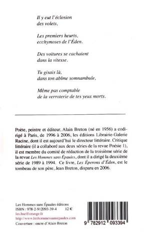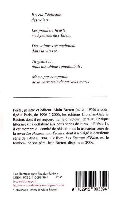 Alain Breton s'est toujours prononcé contre l'hermétisme jugé stérile en poésie, au profit d'une poésie se tenant au plus près du fatum humain contemporain et de la brèche intimiste. Cette exigence est portée à son paroxysme, à son plus haut pic, avec Les Eperons d'Eden. Ce livre est le tombeau de son père, le poète Jean Breton, décédé en 2006 à l'âge de soixante-seize ans.