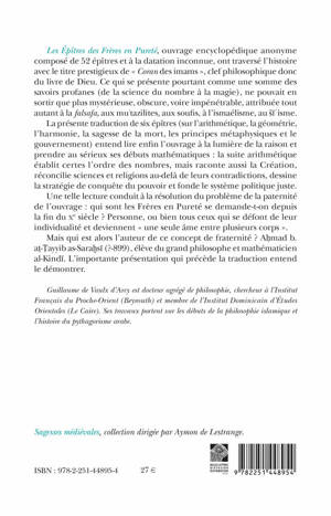 Les Epitres des Freres en Purete, ouvrage encyclopedique anonyme compose de 52 epitres et a la datation inconnue, ont traverse l'histoire avec le titre prestigieux de Coran des imams , clef philosophique donc du livre de Dieu. Ce qui se presente pourtant comme une somme des savoirs profanes (de la science du nombre a la magie), ne pouvait en sortir que plus mysterieuse, obscure, voire impenetrable, attribuee tout autant a la falsafa, aux mu?tazilites, aux soufis, a l'ismaelisme, au si'isme. La presente traduction de six epitres (sur l'arithmetique, la geometrie, l'harmonie, la sagesse de la mort, les principes metaphysiques et le gouvernement) entend lire enfin l'ouvrage a la lumiere de la raison et prendre au serieux ses debuts mathematiques: la suite arithmetique etablit certes l'ordre des nombres, mais raconte aussi la Creation, reconcilie sciences et religions au-dela de leurs contradictions, dessine la strategie de conquete du pouvoir et fonde le systeme politique juste. Une telle lecture conduit a la resolution du probleme de la paternite de l'ouvrage: qui sont les Freres en Purete se demande-t-on depuis la fin du Xe siecle ? Personne, ou bien tous ceux qui se defont de leur individualite et deviennent une seule ame entre plusieurs corps . Mais qui est alors l'auteur de ce concept de fraternite ? Ahmad b. at-Tayyib as-Sarahsi (?-899), eleve du grand philosophe et mathematicien al-Kindi. L'importante presentation qui precede la traduction entend le demontrer.