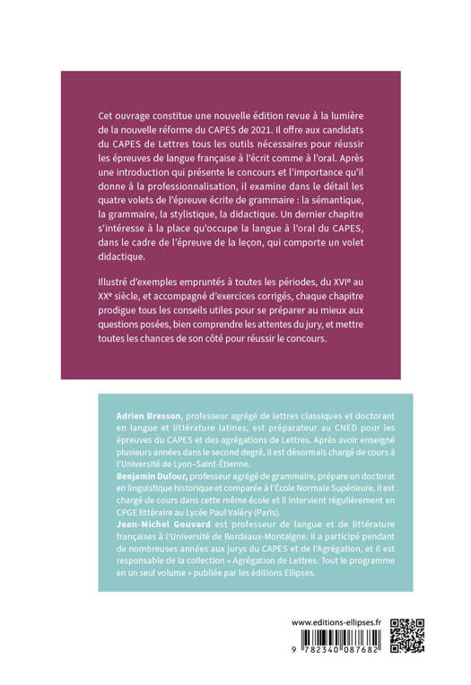 Cet ouvrage constitue une nouvelle édition revue à la lumière de la nouvelle réforme du CAPES de 2021. Il offre aux candidats du CAPES de Lettres tous les outils nécessaires pour réussir les épreuves de langue française à l’écrit comme à l’oral. Après une introduction qui présente le concours et l’importance qu’il donne à la professionnalisation, il examine dans le détail les quatre volets de l’épreuve écrite de grammaire : la sémantique ; la grammaire ; la stylistique ; la didactique. Un dernier chapitre s’intéresse à la place qu’occupe la langue à l’oral du CAPES, dans le cadre de l’épreuve de la leçon, qui comporte un volet didactique.