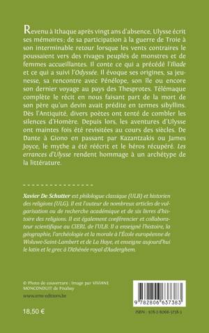 Ulysse écrit ses mémoires. Il conte la guerre de Troie, son interminable retour lorsque les vents le poussaient vers des rivages peuplés de monstres et de femmes accueillantes, mais aussi ce qui a précédé l'Iliade et ce qui a suivi l'Odyssée. Il évoque ses origines, sa jeunesse, sa rencontre avec Pénélope, son île ou encore son dernier voyage au pays des Thesprotes. Télémaque complète le récit en racontant la mort de son père. L'auteur retrace aussi la postérité d'Ulysse dans la littérature.
