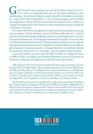 Gilles Veinstein nous transporte au coeur de l'Empire ottoman des XIV-XVIIe siecles, en l'apprehendant par son institution politique la plus emblematique: les esclaves du sultan ou, pour reprendre la formulation ottomane, les esclaves de la Porte (kapi kullari) . Si ces esclaves partagent avec l'ensemble de la population servile de l'Empire ottoman les traits inherents a leur condition, le rang qu'ils occupent dans l'Etat et dans la societe correspond assez peu au cliche du personnel du sultan. Ces esclaves de la Porte temoignent d'un phenomene beaucoup plus ancien qui n'est pas propre a l'Islam mais qui, a partir de l'Empire abbasside au IXe siecle de notre ere, a connu dans plusieurs regimes musulmans un developpement et une place d'une grande importance: l'esclavage gouvernemental ou etatique. En un sens, dans ce domaine comme dans bien d'autres, l'Empire ottoman ne fait que s'inscrire dans la suite des Etats musulmans anterieurs. Cependant, ici comme ailleurs, il renouvelle sur plus d'un point l'institution ancienne: on songe d'abord a cette methode si decriee de recrutement, le devsirme, ou ramassage de jeunes garcons sujets du sultan. La presente edition, issue des cours de Gilles Veinstein au College de France en 2009 et 2010, a ete elaboree par Elisabetta Borromeo a partir d'un premier jet manuscrit, complete par l'enregistrement audio des cours, puis annotee.