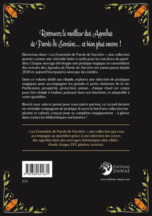 Retrouvez le meilleur des Agendas de Parole de Sorcière… et bien plus encore ! Bienvenue dans Les Essentiels de Parole de Sorcière, une collection pensée comme une véritable boîte à outils pour les sorcières du quotidien. Chaque ouvrage développe une pratique magique en rassemblant des extraits des Agendas de Parole de Sorcière (6 tomes parus depuis 2020 et aujourd’hui épuisés) ainsi que des inédits. Dans ce volume dédié aux rituels, explorez une sélection de pratiques magiques pour accompagner les grands et petits moments de la vie. Purification, prospérité, protection, amour… chaque rituel est conçu pour être simple à réaliser, puissant dans son intention, et adaptable à votre quotidien. Illustré avec soin et pensé pour vous suivre partout, ce recueil devient un véritable compagnon de pratique. Il ouvre le bal d’une collection inspirante et colorée, conçue pour se compléter magiquement – à glisser dans toutes les bibliothèques enchantées ! Les Essentiels de Parole de Sorcière, une collection qui vous accompagne au quotidien grâce à une sélection des textes des agendas dans des ouvrages thématiques plus ciblés : rituels, tirages, DIY, plantes, recettes.