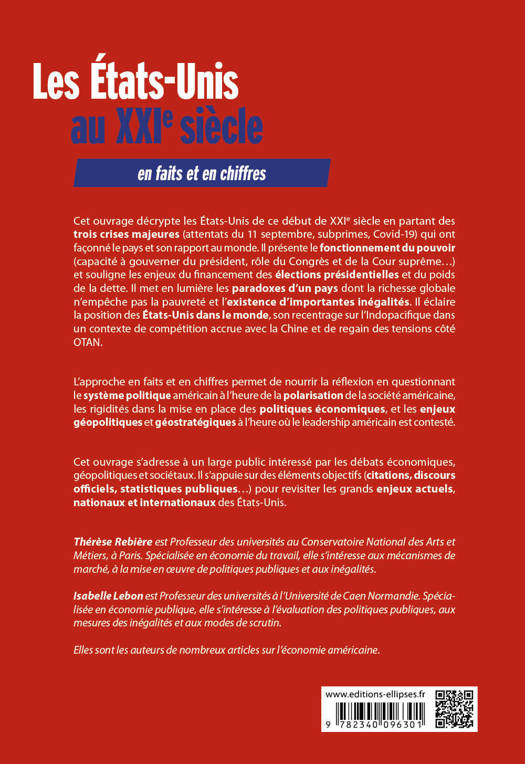 Cet ouvrage décrypte les Etats-Unis de ce début de XXIe siècle en partant des trois crises majeures (attentats du 11 septembre, subprimes, Covid-19) qui ont façonné le pays et son rapport au monde. Il présente le fonctionnement du pouvoir (capacité à gouverner du président, rôle du Congrès et de la Cour suprême…) et souligne les enjeux du financement des élections présidentielles et du poids de la dette. Il met en lumière les paradoxes d’un pays dont la richesse globale n’empêche pas la pauvreté et l’existence d’importantes inégalités. Il éclaire la position des Etats-Unis dans le monde, son recentrage sur l’Indopacifique dans un contexte de compétition accrue avec la Chine et de regain des tensions côté OTAN.