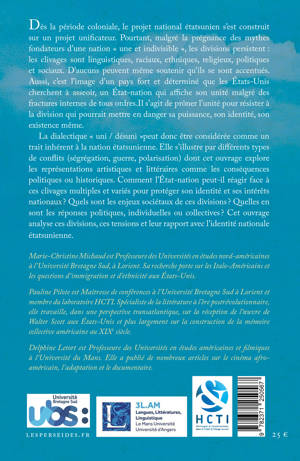 La dialectique « uni / désuni »peut donc être considérée comme un trait inhérent à la nation étatsunienne. Elle s’illustre par différents types de conflits (ségrégation, guerre, polarisation) dont cet ouvrage explore les représentations artistiques et littéraires comme les conséquences politiques ou historiques. Comment l’État-nation peut-il réagir face à ces clivages multiples et variés pour protéger son identité et ses intérêts