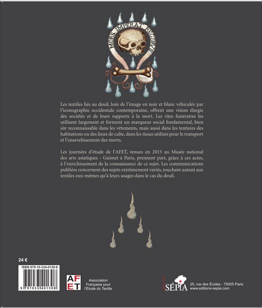 Les textiles liés au deuil, loin de l'image en noir et blanc véhiculée par l'iconographie occidentale contemporaine, offrent une vision élargie des sociétés et de leurs rapports à la mort. Les rites funéraires les utilisent largement et forment un marqueur social fondamental, bien sûr reconnaissable dans les vêtements, mais aussi dans les tentures des habitations ou des lieux de culte, dans les tissus utilisés pour el transport et l'ensevelissement des morts.