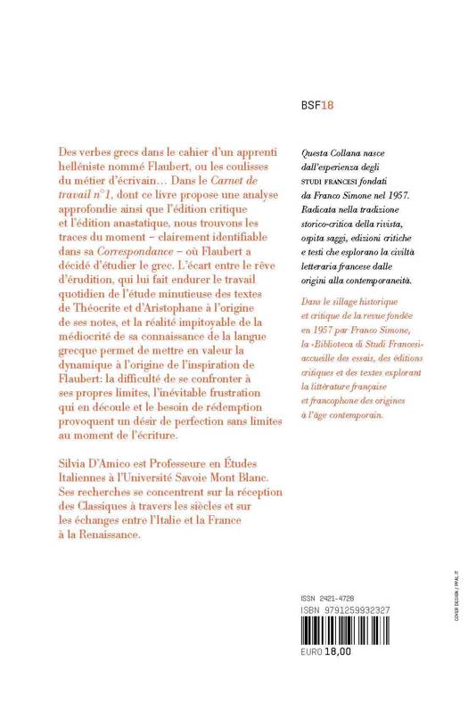 Des verbes grecs dans le cahier d’un apprenti helléniste nommé Flaubert, ou les coulisses du métier d’écrivain... Dans le Carnet de travail n°1, dont ce livre propose une analyse approfondie ainsi que l’édition critique et l’édition anastatique, nous trouvons les traces du moment – clairement identifiable dans sa Correspondance – où Flaubert a décidé d’étudier le grec. L’écart entre le rêve d’érudition, qui lui fait endurer le travail quotidien de l’étude minutieuse des textes de Théocrite et d’Aristophane à l’origine de ses notes, et la réalité impitoyable de la médiocrité de sa connaissance de la langue grecque permet de mettre en valeur la dynamique à l’origine de l’inspiration de Flaubert: la difficulté de se confronter à ses propres limites, l’inévitable frustration qui en découle et le besoin de rédemption provoquent un désir de perfection sans limites au moment de l’écriture