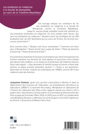 Cet ouvrage analyse les conditions de vie des étudiantes en médecine à la faculté de Montpellier, durant la Troisième République. Qui sont ces étudiantes en médecine ? Quelles furent les stratégies de ces 458 étudiantes (sur les 657 identifiées) qui au cours de 70 ans, ont terminé leur cursus universitaire ? D'où viennent-elles ? Quelles sont leurs nationalités ? Comment ont-elles vécu à Montpellier ? Quels furent leurs sujets de thèse ? Thèse de doctorat d'université ? Thèse de doctorat d'état ? Ces premières étudiantes françaises et étrangères qui osent transgresser les normes imposées aux femmes à cette époque vont devenir des modèles.